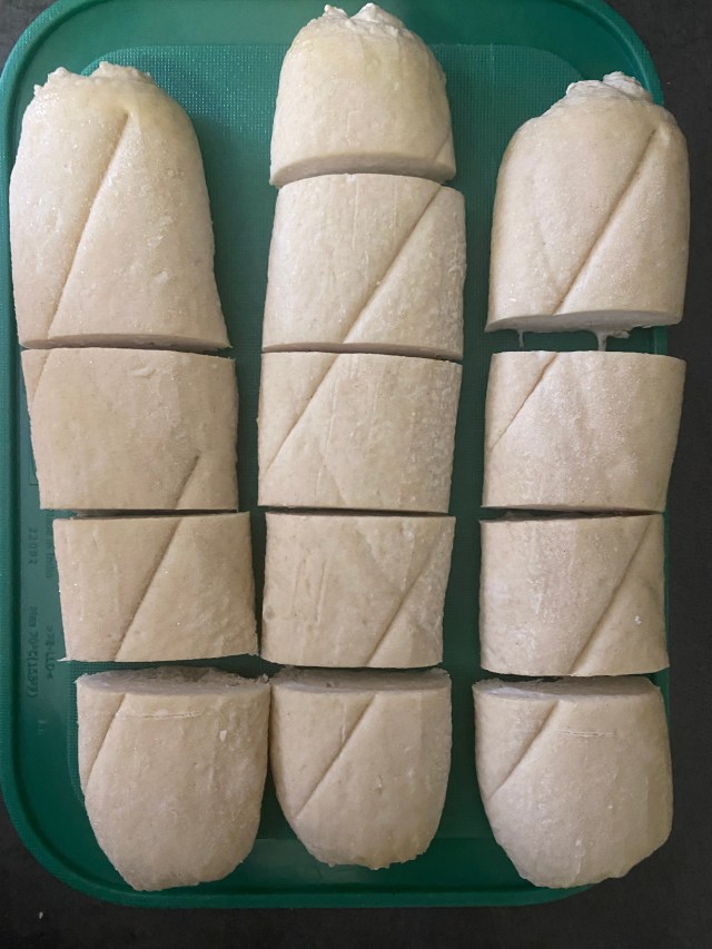 Sobald die Laugenstangen ausreichend aufgetaut sind, werden sie in kleine Stücke geschnitten. Diese Stücke können dann mit der Oberseite in die vorbereiteten Schüsseln mit den Toppings getaucht werden. Es bietet sich an, verschiedene Toppings zu kombinieren, um eine bunte Vielfalt an Laugenbrötchen zu erhalten.