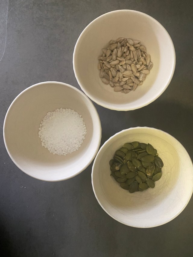 Die gewünschten Toppings werden jeweils in kleine Schüsseln gegeben. Klassische Varianten sind Salz, Sonnenblumenkerne, Kürbiskerne, Mohn und Sesam. Doch der Kreativität sind keine Grenzen gesetzt. Auch grob gehackte Nüsse oder Käse könnten interessante Alternativen darstellen.