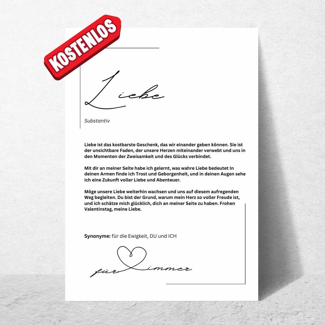 Neben den bereits vorgeschlagenen Geschenkideen und Unternehmungen, freue ich mich, Ihnen eine zusätzliche Überraschung anzubieten: ein kostenloses Poster zum Herunterladen im PDF-Format, das die Definition von Liebe auf eine künstlerische Weise darstellt.
